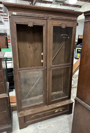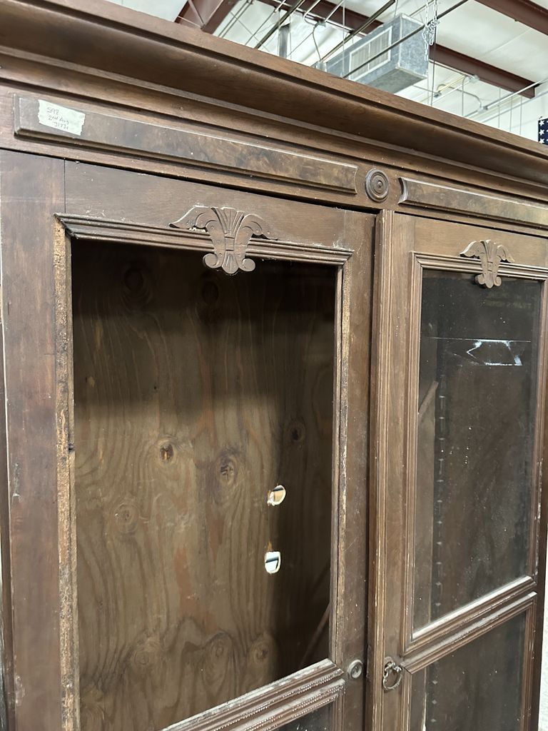 Antique Mahogany Victorian Style Bookcase, needs structural work, one door missing glass, has wood shelves, needs wood finish work, project piece, 78"h., 43"w. 18"d. Location Row 12 Antique Mahogany Victorian Style Bookcase, needs structural work, one door missing glass, has wood shelves, needs wood finish work, project piece, 78"h., 43"w. 18"d. Location Row 12