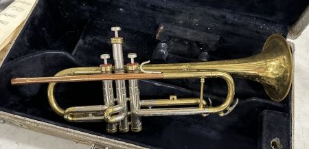 CONN Vintage Trumpet, in case, missing piece, Location Back Metal Shelves CONN Vintage Trumpet, in case, missing piece, Location Back Metal Shelves