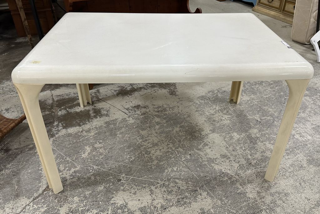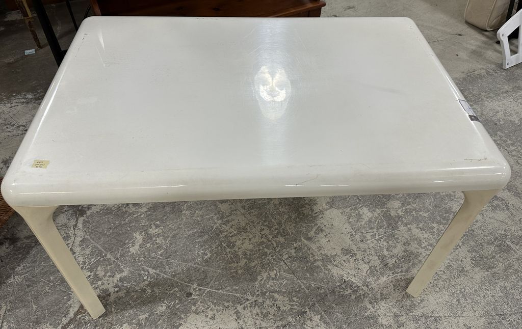 Mid Century White Hard Plastic Table, 28"h., 48"w, Mid Century White Hard Plastic Table, 28"h., 48"w,