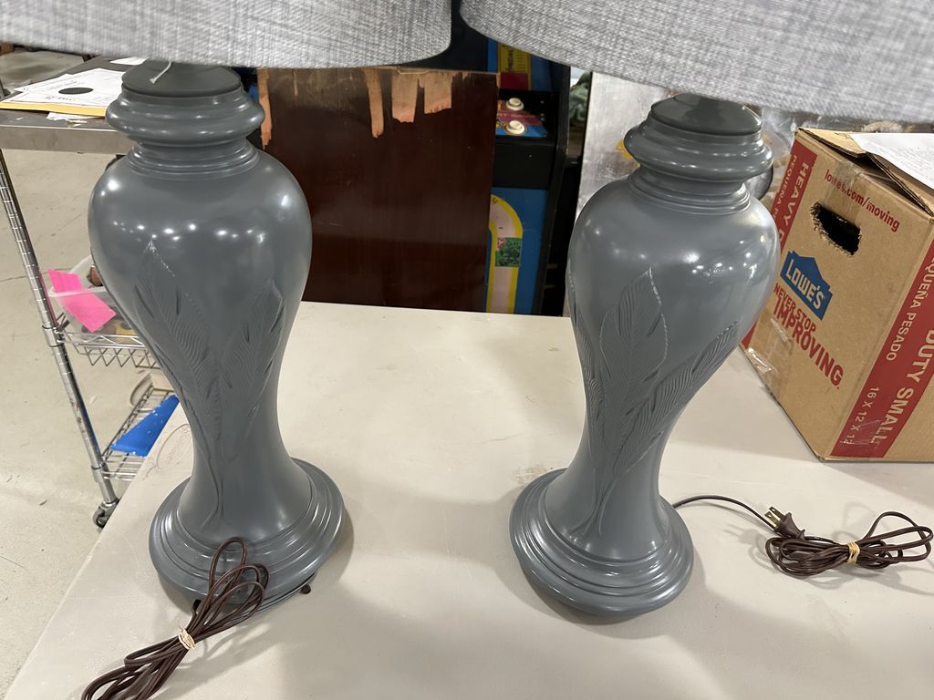 Pair of Grey Painted Glass Vase Lamps, Location Right Metal Shelves Pair of Grey Painted Glass Vase Lamps, Location Right Metal Shelves