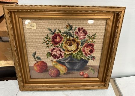 Framed Cross Stitch Still Life, 16"h, 18"w, Location Back Metal Shelves Framed Cross Stitch Still Life, 16"h, 18"w, Location Back Metal Shelves