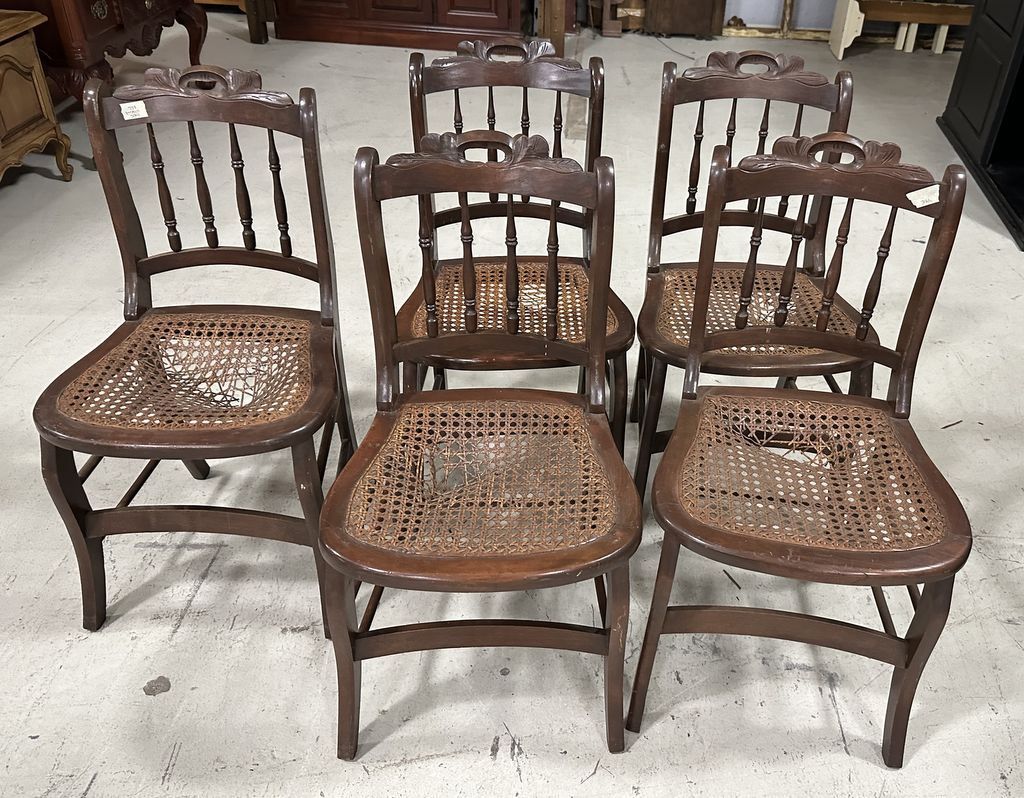 Five Vintage Mahogany Cane Side Chairs , seats are damaged, Location Row 5 Five Vintage Mahogany Cane Side Chairs , seats are damaged, Location Row 5