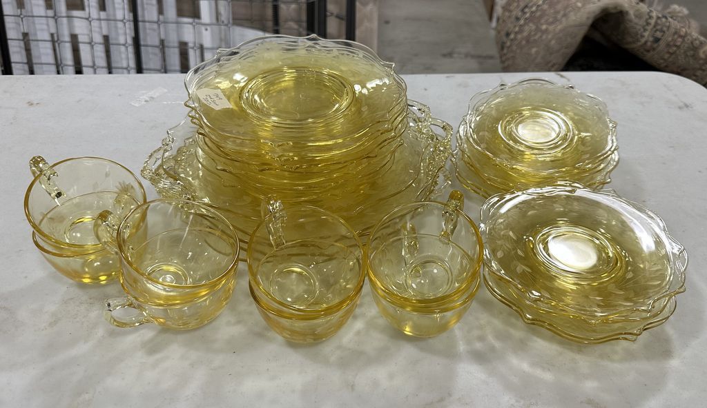 Yellow Etched Depression Glass Plates and Cups, Location Right Metal Shelves Yellow Etched Depression Glass Plates and Cups, Location Right Metal Shelves