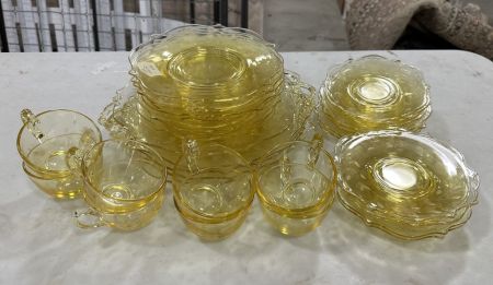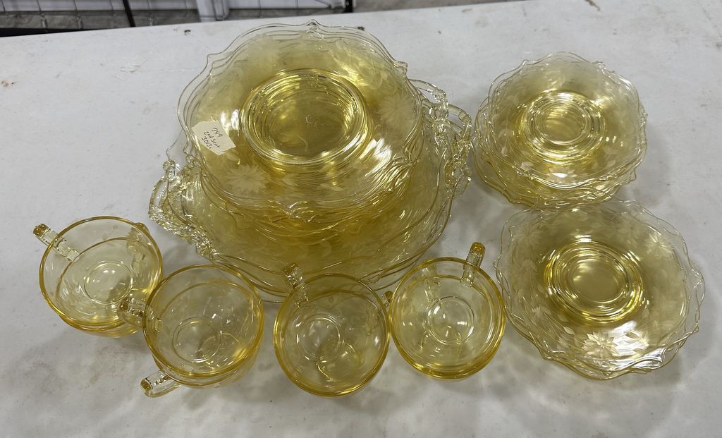 749 Yellow Etched Depression Glass Plates and Cups