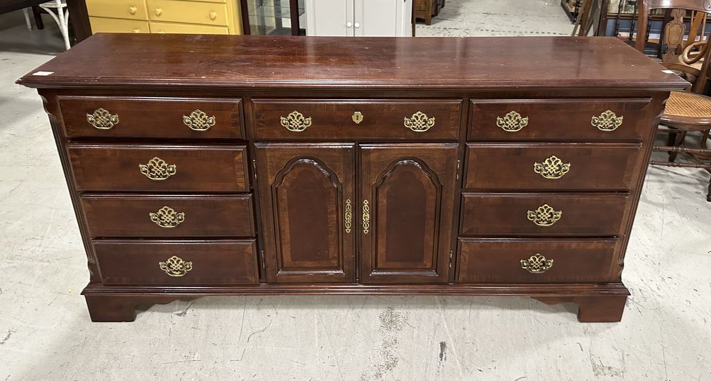 Modern Cherry Traditional Style Triple Dresser, has finish wear, 33"h., 70"w. Modern Cherry Traditional Style Triple Dresser, has finish wear, 33"h., 70"w.