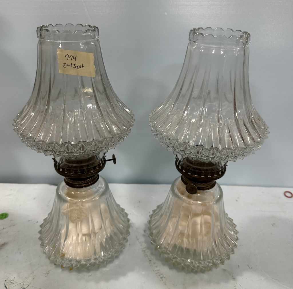Pair of Vintage Glass Oil Lamps, 13"h, Location Back Metal Shelves Pair of Vintage Glass Oil Lamps, 13"h, Location Back Metal Shelves