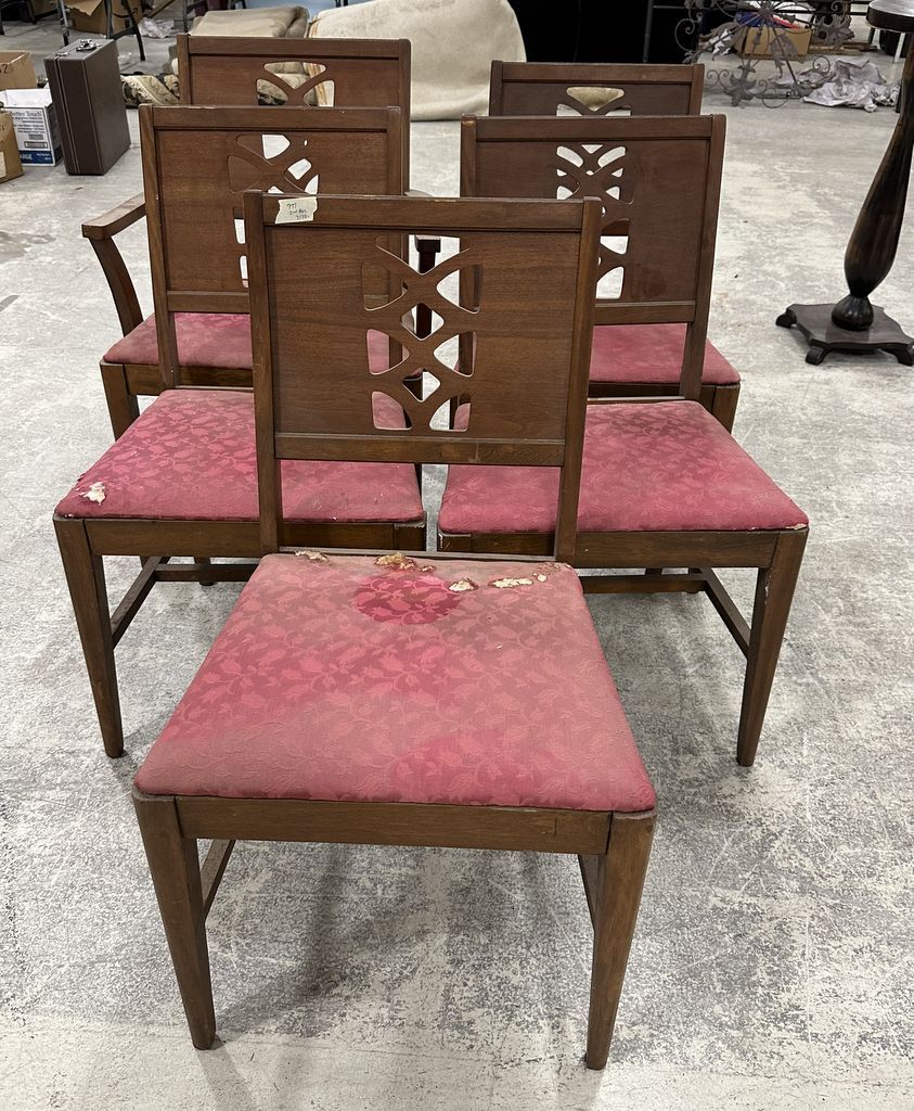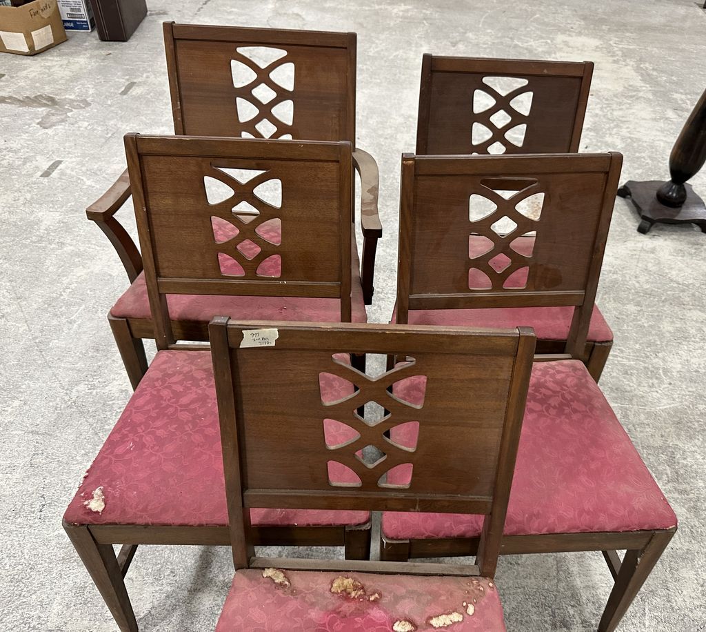 Five Mahogany Dining Chairs, one damaged, one arm, four sides. Five Mahogany Dining Chairs, one damaged, one arm, four sides.