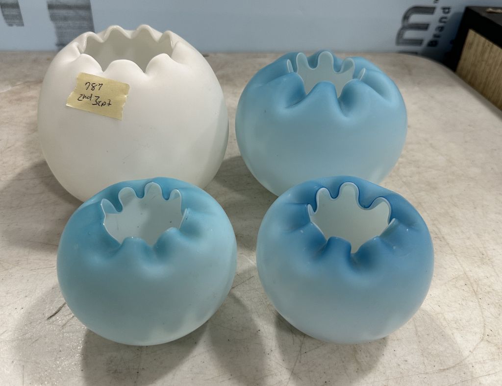 Four Satin Glass Rose Bowls, Location Back Metal Shelves Four Satin Glass Rose Bowls, Location Back Metal Shelves