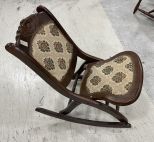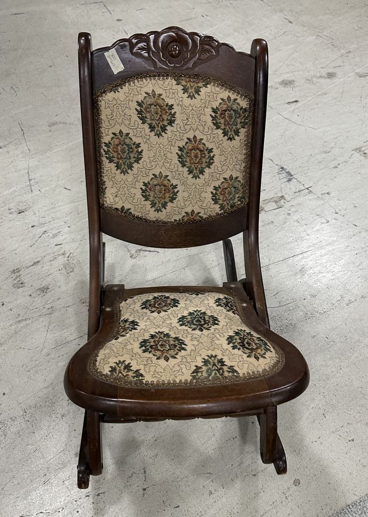Cherry Folding Sewing Rocker, carved flower crest, good condition. Cherry Folding Sewing Rocker, carved flower crest, good condition.