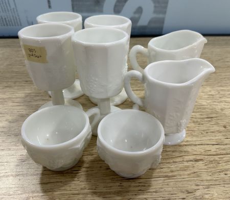 Westmoreland Milk Glass Goblets, Cups, and Pitchers, Location Back Metal Shelves Westmoreland Milk Glass Goblets, Cups, and Pitchers, Location Back Metal Shelves
