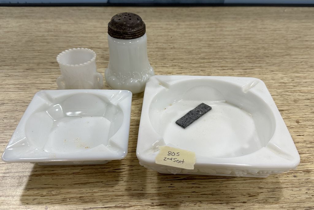 Westmoreland Milk Glass Ashtray, Toothpick, and Shaker, Location Back Metal Shelves Westmoreland Milk Glass Ashtray, Toothpick, and Shaker, Location Back Metal Shelves