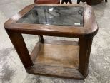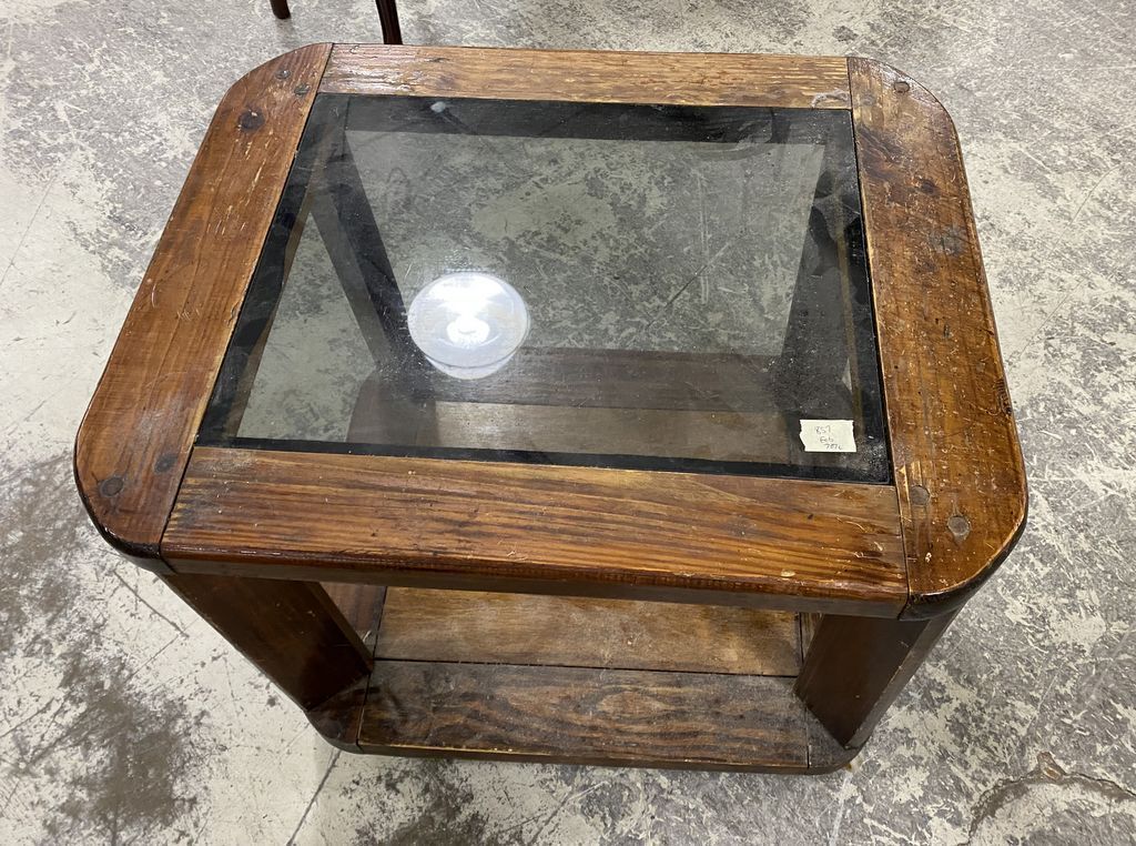 Late 20th Century Pine Lamp Table, glass top, finish is worn, 22"h. 25"w, Location Row 7 Late 20th Century Pine Lamp Table, glass top, finish is worn, 22"h. 25"w, Location Row 7