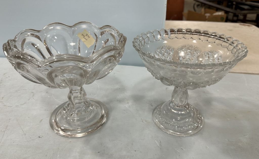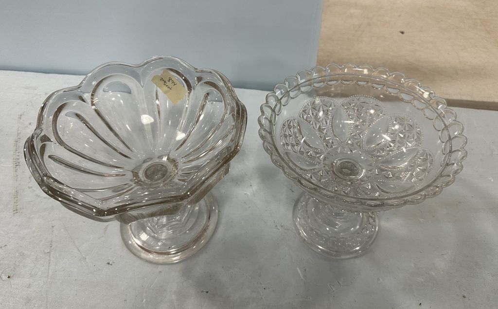 EAPG Loop Compote and Pressed Glass Compote, Location Back Metal Shelve EAPG Loop Compote and Pressed Glass Compote, Location Back Metal Shelve