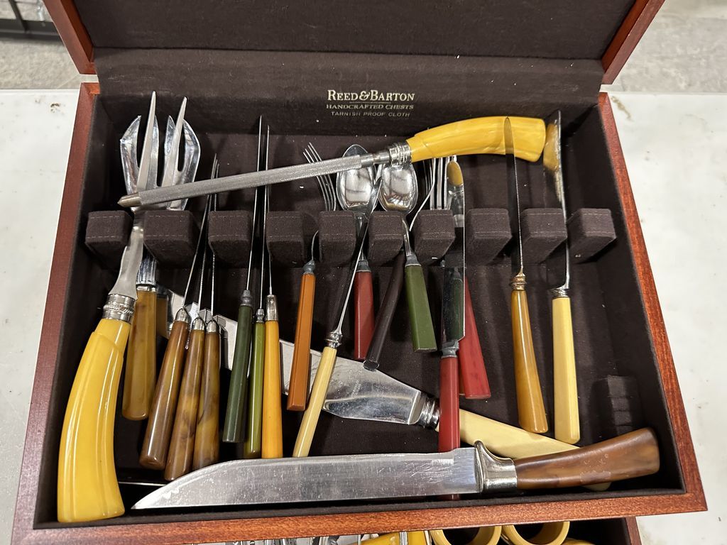 Bakelite Style Flatware Places, cake breakers, servers, knives, in box, Location Right Metal Shelves Bakelite Style Flatware Places, cake breakers, servers, knives, in box, Location Right Metal Shelves