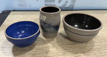 Three Stoneware Pottery Bowls and Container, Location Back Metal Shelves Three Stoneware Pottery Bowls and Container, Location Back Metal Shelves