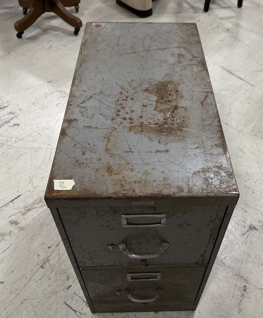 Steel Cage File Cabinet, two drawer, worn, Location Back Wall Steel Cage File Cabinet, two drawer, worn, Location Back Wall