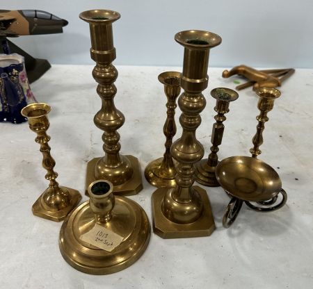 Group of Brass Candle Holders, Location Front Wood Shelves Group of Brass Candle Holders, Location Front Wood Shelves