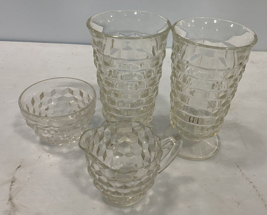 Four Piece Whitehall Glass Cups, and Creamer, Location Front Shelves Four Piece Whitehall Glass Cups, and Creamer, Location Front Shelves