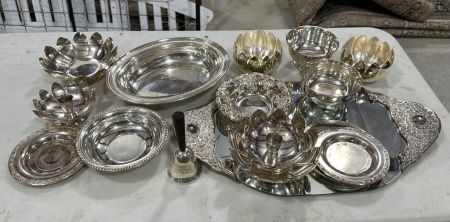 Group of Silver Plate Serving Pieces, dishes, platter, bell, candle holders, Location Right Metal Shelves Group of Silver Plate Serving Pieces, dishes, platter, bell, candle holders, Location Right Metal Shelves