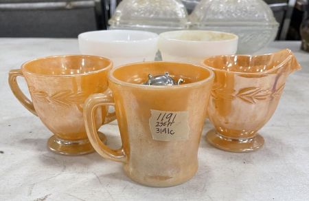 1191 Two Milk Glass Cups and Three Creamer Sugar and Cup iridescent Orange