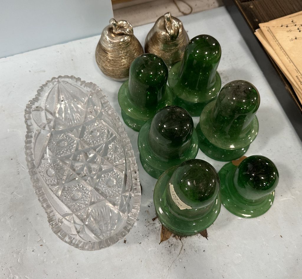 Green Glass Candle Holders, Pressed Glass Dish, and Pears, Location Back Metal Shelves Green Glass Candle Holders, Pressed Glass Dish, and Pears, Location Back Metal Shelves
