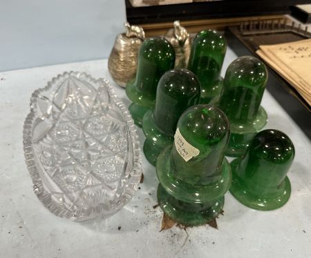 1198 Green Glass Candle Holders, Pressed Glass Dish, and Pears