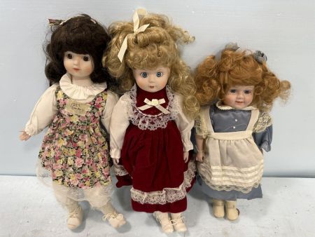 Three Porcelain Girl Dolls, 17"h, Location Right Metal Shelves Three Porcelain Girl Dolls, 17"h, Location Right Metal Shelves