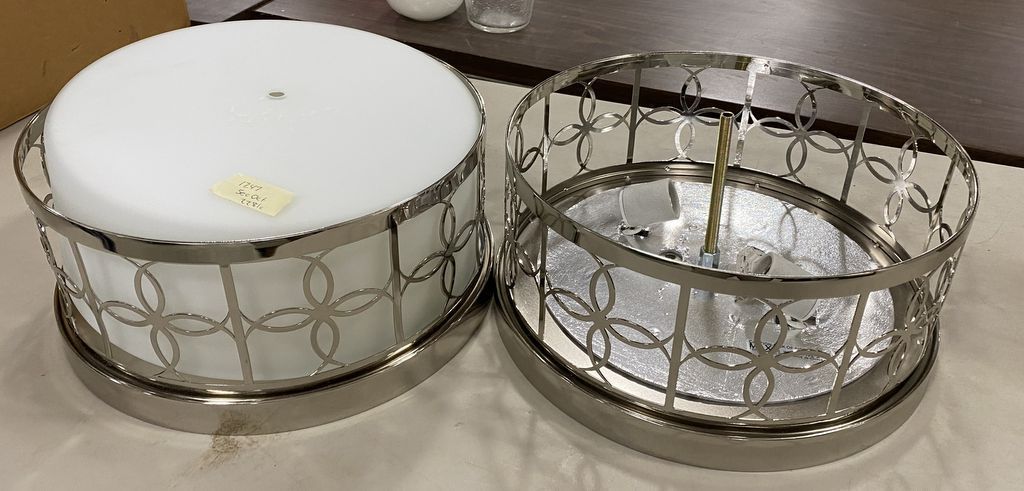 Pair of Contemporary Flush Mount Light Fixtures, one missing shade, Location Back Metal Shelves Pair of Contemporary Flush Mount Light Fixtures, one missing shade, Location Back Metal Shelves