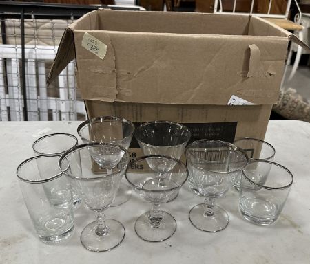 Group of Silver Rimmed Crstyal Stemware, Location Back Metal Shelves Group of Silver Rimmed Crstyal Stemware, Location Back Metal Shelves