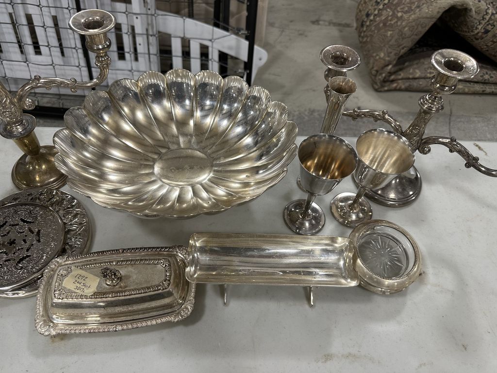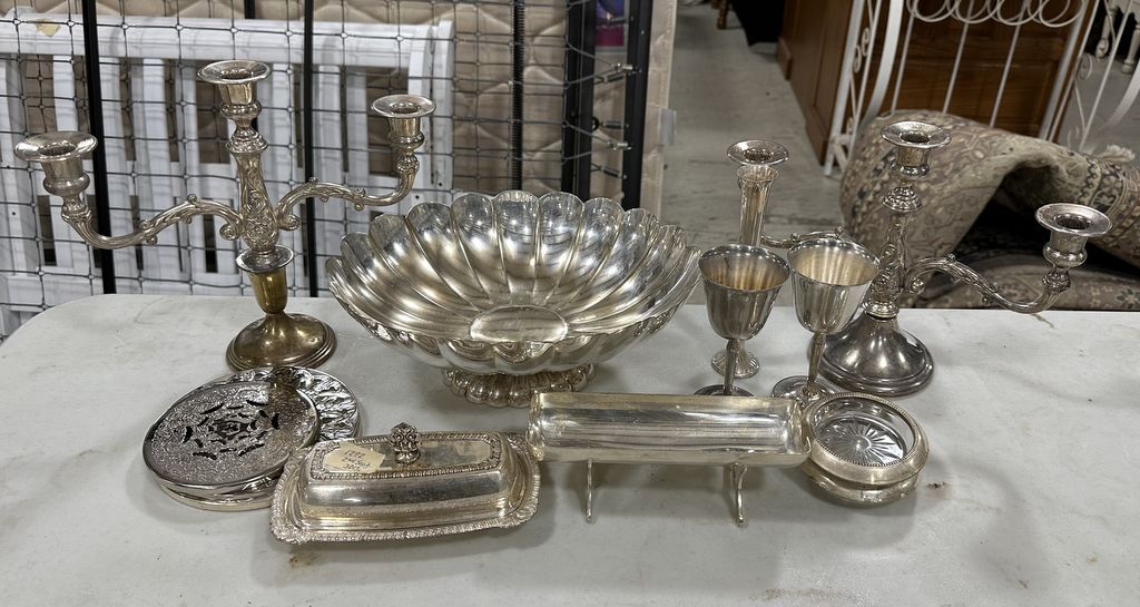 Group of Silver Plate Serving Pieces, candle holders, footed bowl, coasters, goblets, trivets, Location Right Metal Shelves Group of Silver Plate Serving Pieces, candle holders, footed bowl, coasters, goblets, trivets, Location Right Metal Shelves