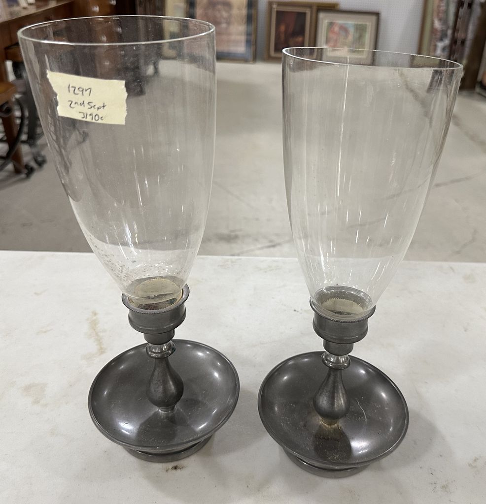 Two Metal Glass Shaded Candle Holders, 13"h, Location Front Wood Shelves Two Metal Glass Shaded Candle Holders, 13"h, Location Front Wood Shelves