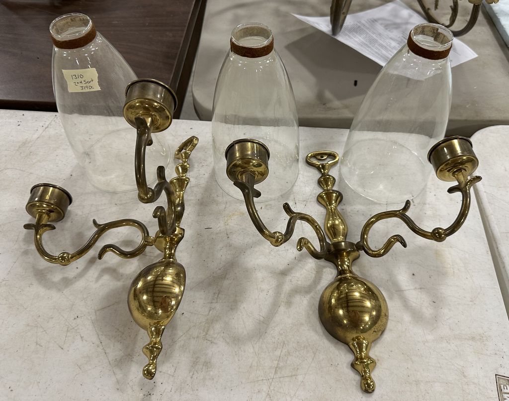 Brass Two Arm Wall Sconces, glass shades, Location Front Wood Shelves Brass Two Arm Wall Sconces, glass shades, Location Front Wood Shelves