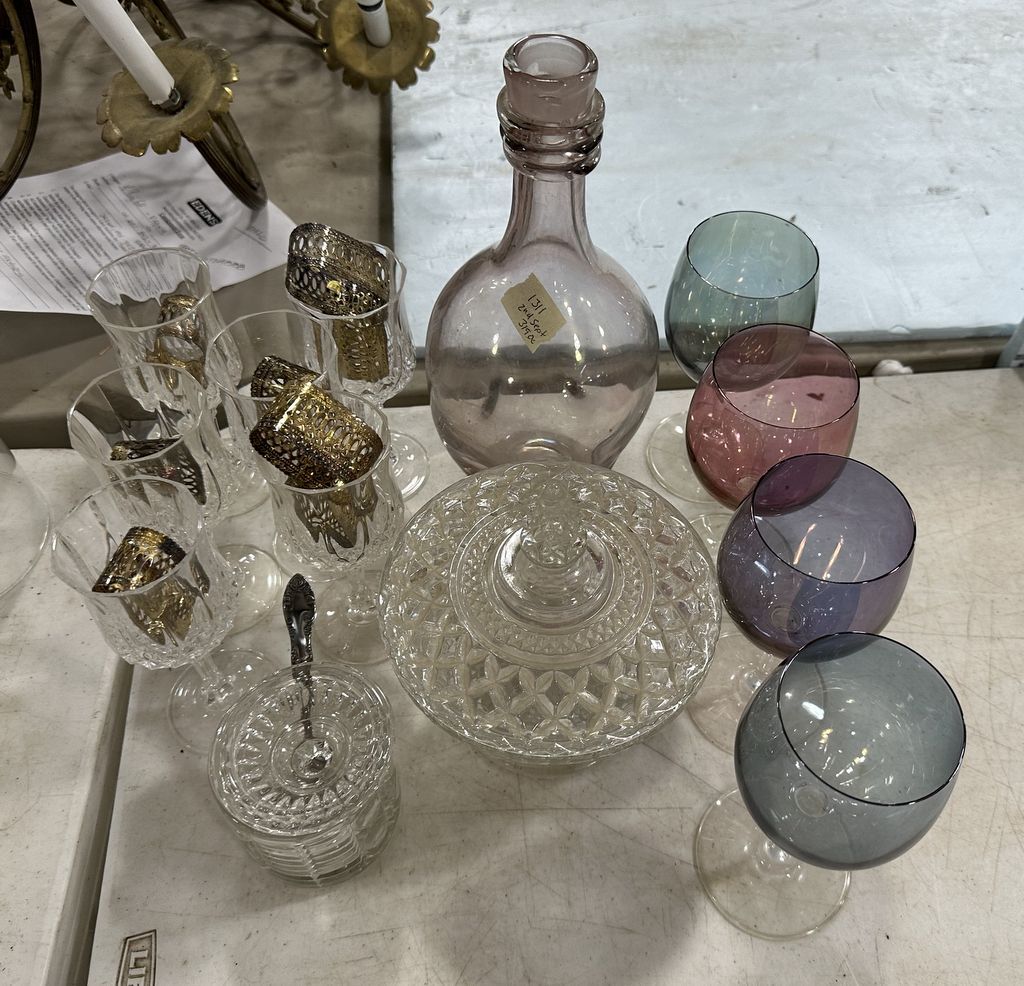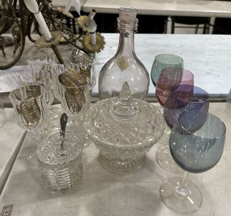 Decanter, wine glasses, candy dish, conidment jar, Location Front Wood Shelves Decanter, wine glasses, candy dish, conidment jar, Location Front Wood Shelves