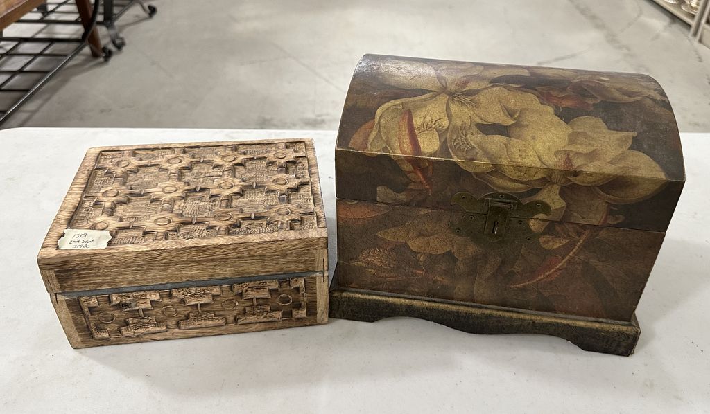 Two Decorative Storage Boxes, Location Front Wood Shelves Two Decorative Storage Boxes, Location Front Wood Shelves