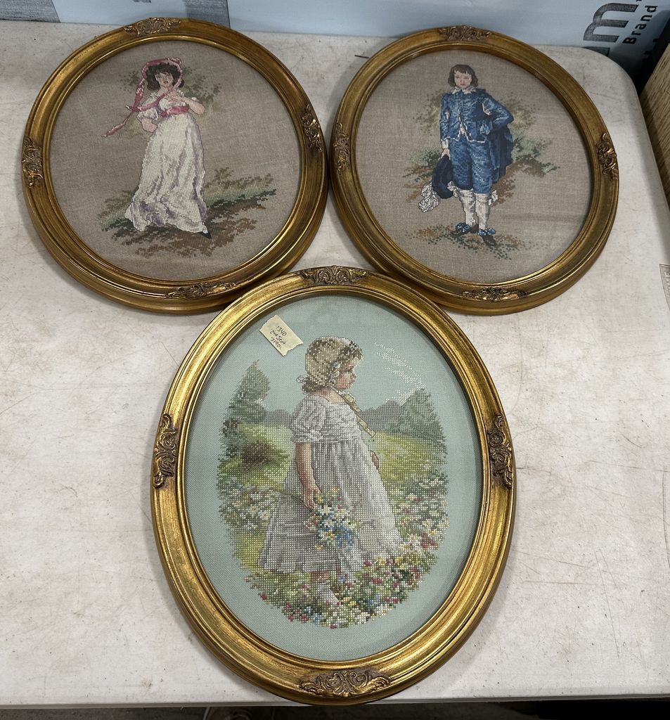 Three Oval Cross Stitch Lady, Gent, and Girl Framed, Location Back Metal Shelves Three Oval Cross Stitch Lady, Gent, and Girl Framed, Location Back Metal Shelves