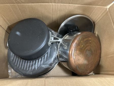 Box Lot of Pots and Pans, Location Back Metal Shelves Box Lot of Pots and Pans, Location Back Metal Shelves