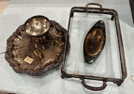 Group of Silver Plate Serving Pieces, Casserole stand, trays, bowl, dish, snuffer Group of Silver Plate Serving Pieces, Casserole stand, trays, bowl, dish, snuffer