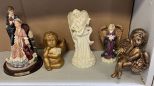 Resin Figural Meerchi Sculpture, Resin Angel, Porcelain Angel, One Seated Ceramic Cherub, and One Plastic Cherub, Location Front Wood Shelves Resin Figural Meerchi Sculpture, Resin Angel, Porcelain Angel, One Seated Ceramic Cherub, and One Plastic Cherub, Location Front Wood Shelves
