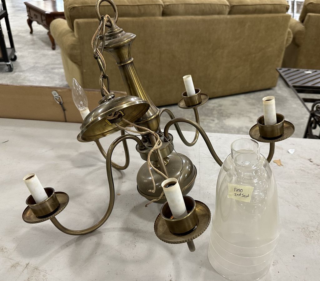 Brass 5 Arm Chandelier, with glass shades, Location Back Brass 5 Arm Chandelier, with glass shades, Location Back