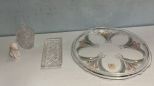 1485 Platter, Pressed Glass Butter Tray, Covered Pressed Glass Bowl, and Cow Creamer.