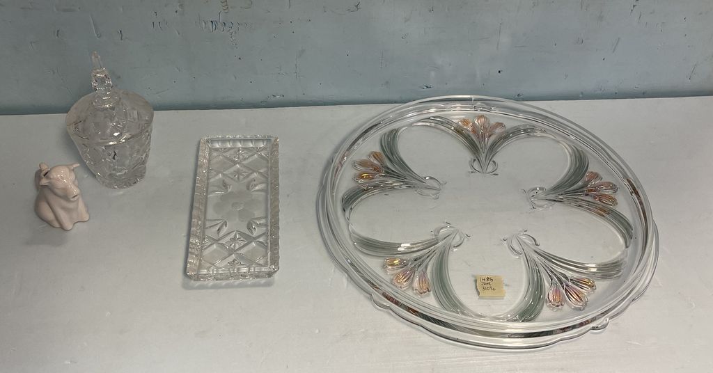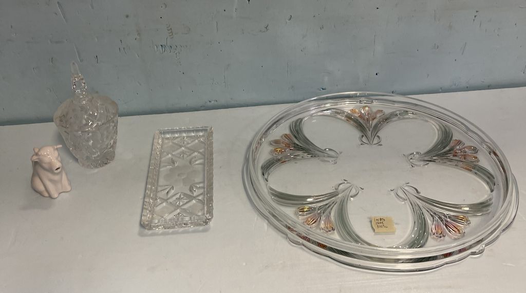 Platter, Pressed Glass Butter Tray, Covered Pressed Glass Bowl, and Cow Creamer. Location Front Wood shelves Platter, Pressed Glass Butter Tray, Covered Pressed Glass Bowl, and Cow Creamer. Location Front Wood shelves