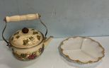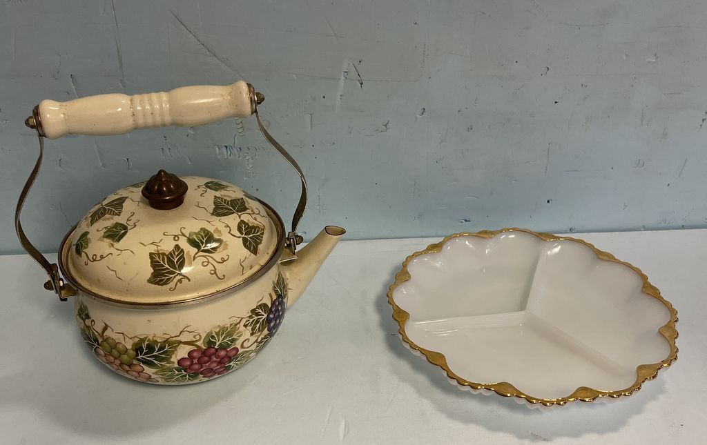 Teapot Kettle and Divided Dish, Location Front Wood shelves Teapot Kettle and Divided Dish, Location Front Wood shelves