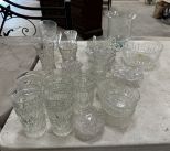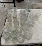 Group of Vintage Pressed Nappys and Cups, Bows, Location Back Metal Shelves Group of Vintage Pressed Nappys and Cups, Bows, Location Back Metal Shelves