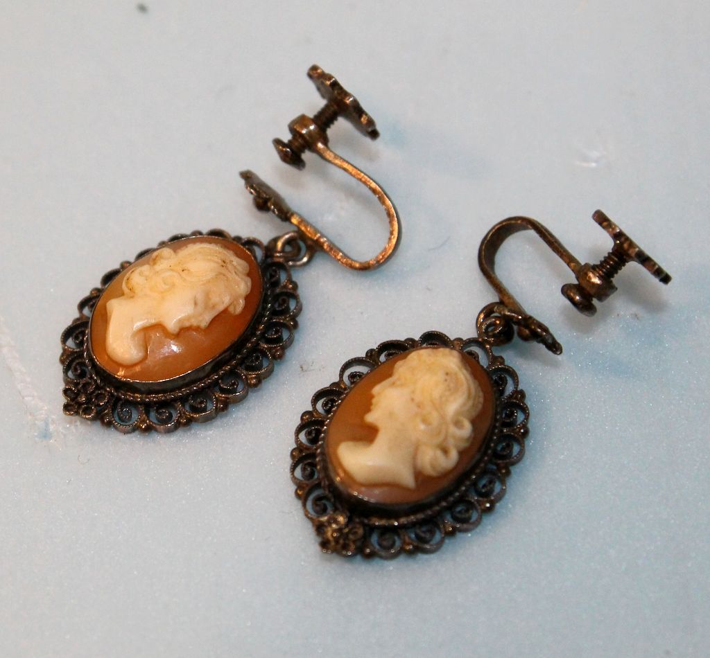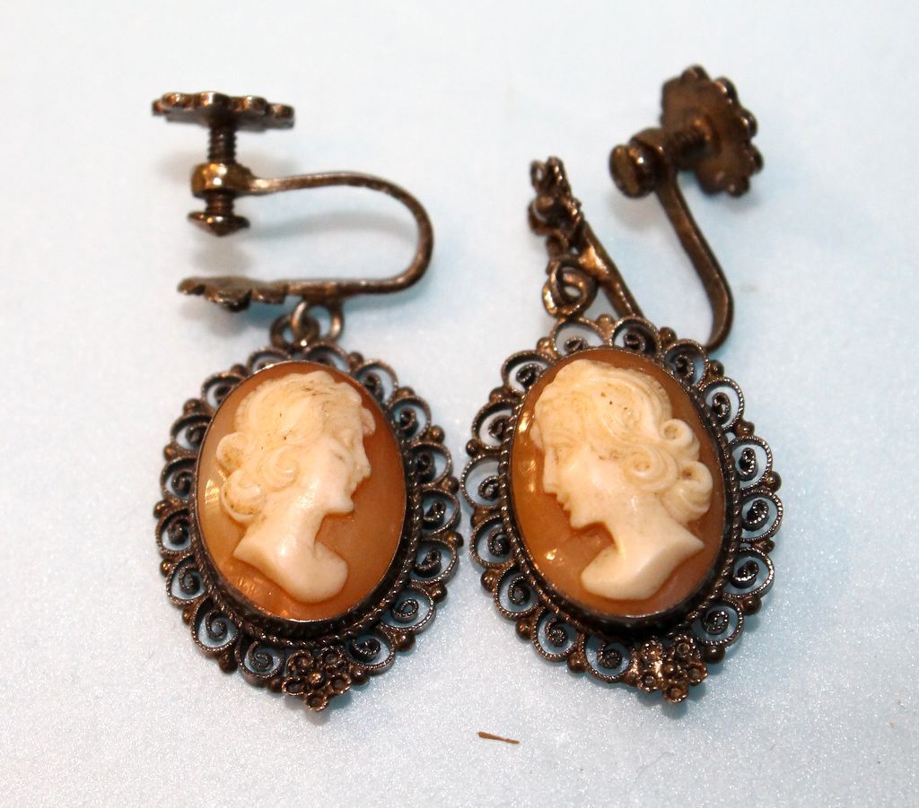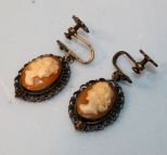 301 Pair of Vintage Cameo .800 Filigree Dangle Earrings