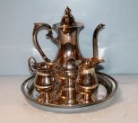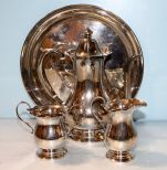 Four piece sterling tea set consists of teapot, creamer, sugar, and tray. Marked M (Muieck-Carey Company. New York 1940-1950) ; tray, 11" dia. 39.975 troy ounces. Four piece sterling tea set consists of teapot, creamer, sugar, and tray. Marked M (Muieck-Carey Company. New York 1940-1950) ; tray, 11" dia. 39.975 troy ounces.