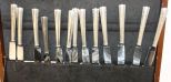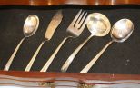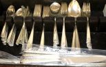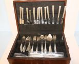 One hundred thirteen pieces of Alvin "Chapel Bells" sterling. Set consists of eighteen teaspoons, twelve spreaders, twelve dinner forks, twelve salad forks, twelve dessert forks, twelve soup spoons, six serving spoons, twenty-five dinner knives, table spoon, pie server, meat fork and ladle. 116.575 troy ounces (not including dinner knives). One hundred thirteen pieces of Alvin "Chapel Bells" sterling. Set consists of eighteen teaspoons, twelve spreaders, twelve dinner forks, twelve salad forks, twelve dessert forks, twelve soup spoons, six serving spoons, twenty-five dinner knives, table spoon, pie server, meat fork and ladle. 116.575 troy ounces (not including dinner knives).