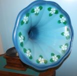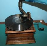 Oak table top model victrola with painted horn. Victrola plays records and works well. Oak table top model victrola with painted horn. Victrola plays records and works well.