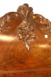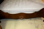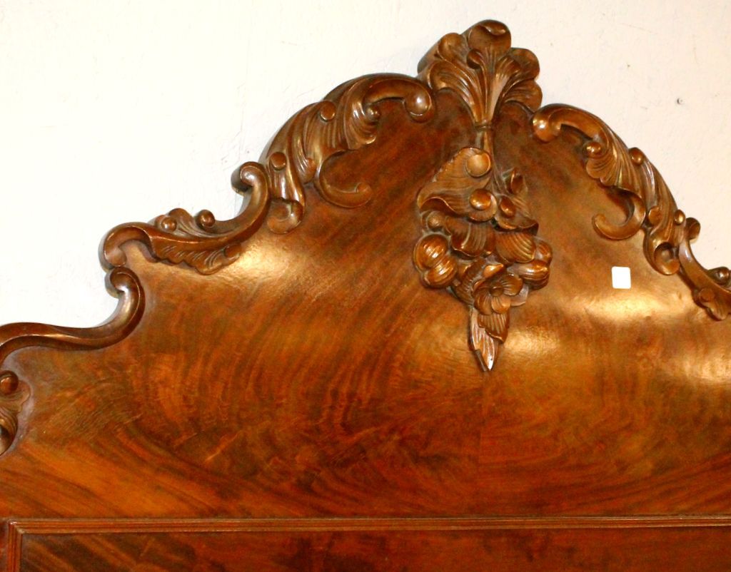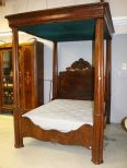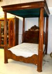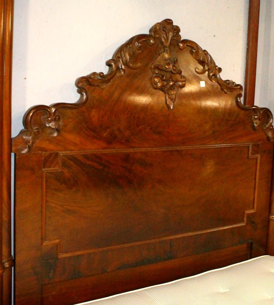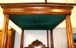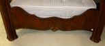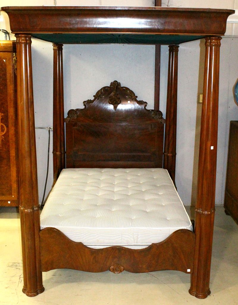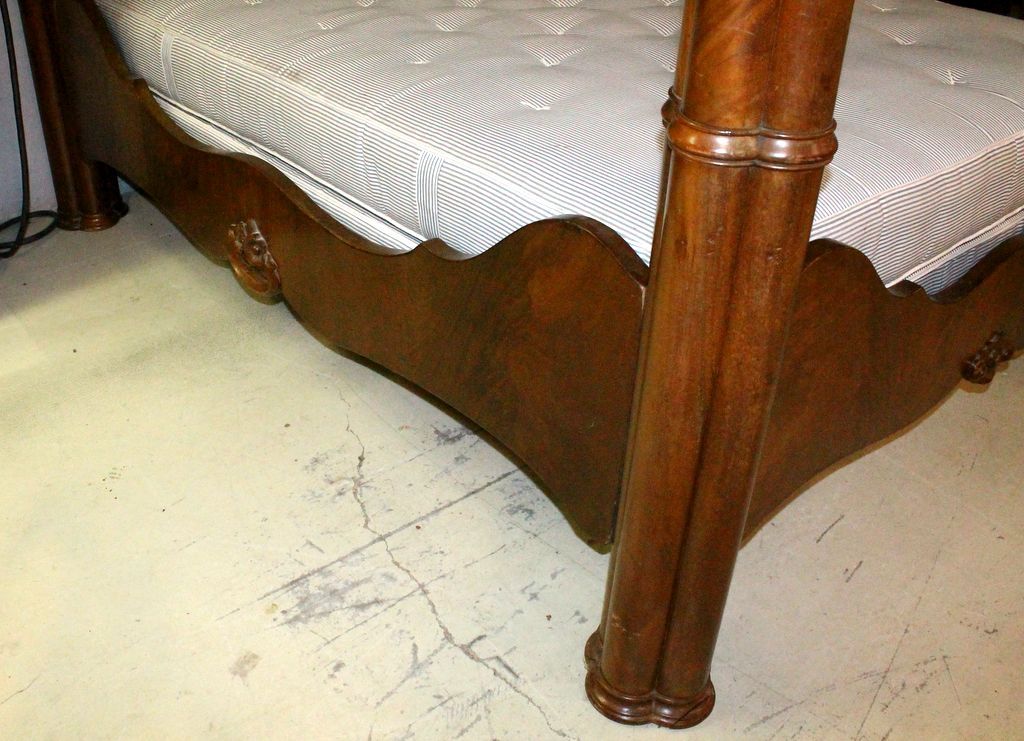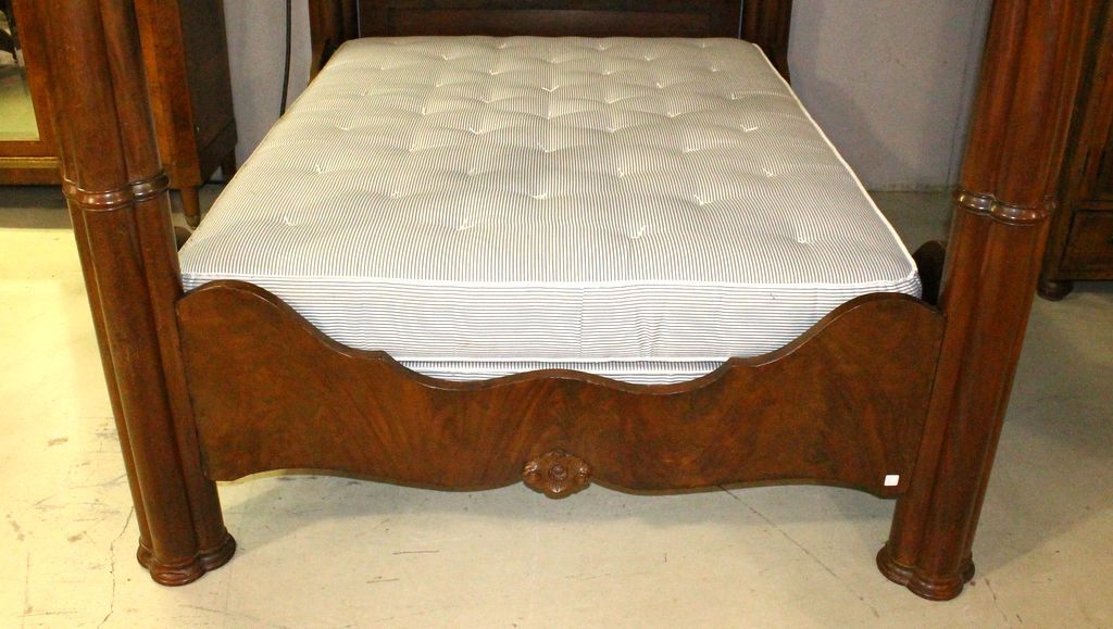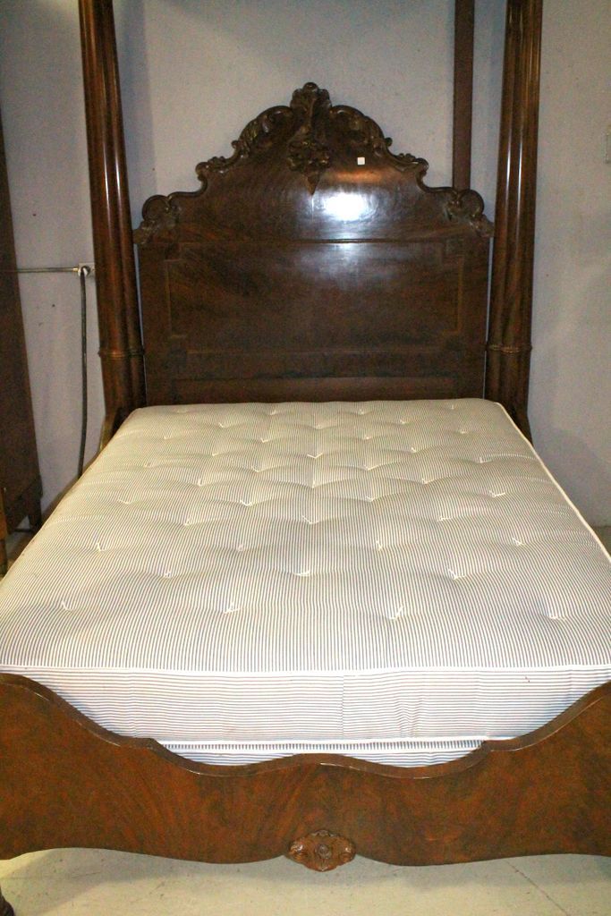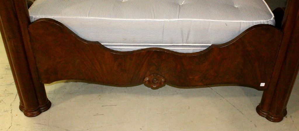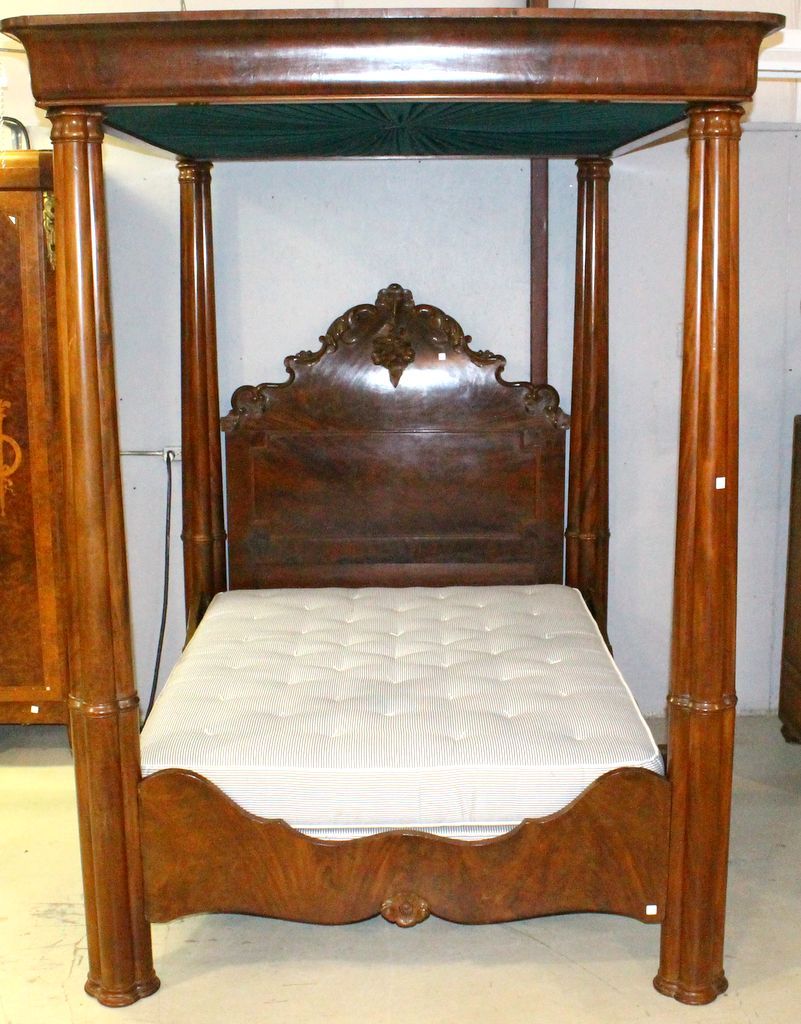 19th century mahogany cluster post, full tester bed. Mahogany plantation bed with foliage scrolled, flower carved headboard, cluster shaped posts with ogee crown molding, custom mattress; 55" w., 73 1/2" l., 8' 3" h. 19th century mahogany cluster post, full tester bed. Mahogany plantation bed with foliage scrolled, flower carved headboard, cluster shaped posts with ogee crown molding, custom mattress; 55" w., 73 1/2" l., 8' 3" h.