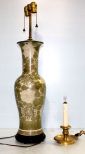 Porcelain painted lamp on carved wood base and small brass lamp; 31 1/2" h. and 11" h. Porcelain painted lamp on carved wood base and small brass lamp; 31 1/2" h. and 11" h.