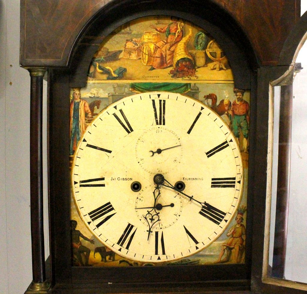 JA & Cibson (Kilwinning) mahogany 19th century grandfather clock with painted figures representing the continents of America, Asia, Africa, and Europe; 19" w., 85" h. JA & Cibson (Kilwinning) mahogany 19th century grandfather clock with painted figures representing the continents of America, Asia, Africa, and Europe; 19" w., 85" h.